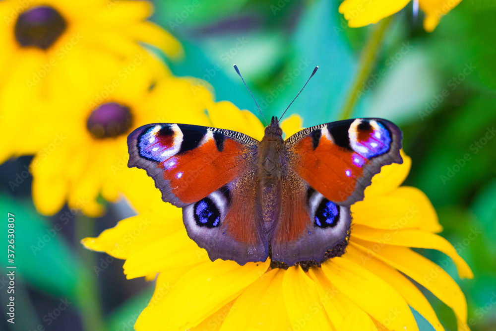 The urticaria butterfly sits on a yellow flower . beautiful butterfly. Insect . Insect on a flower. Butterfly on a flower.