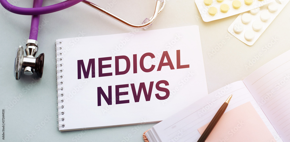 Medical news text on notepad. Latest medical information concept. Pills, pen and stethoscope