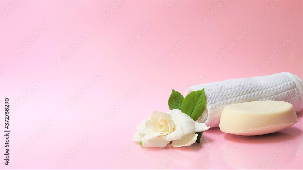 Spa setting and Spa background composition with white gardenia flower on pink background. Banner