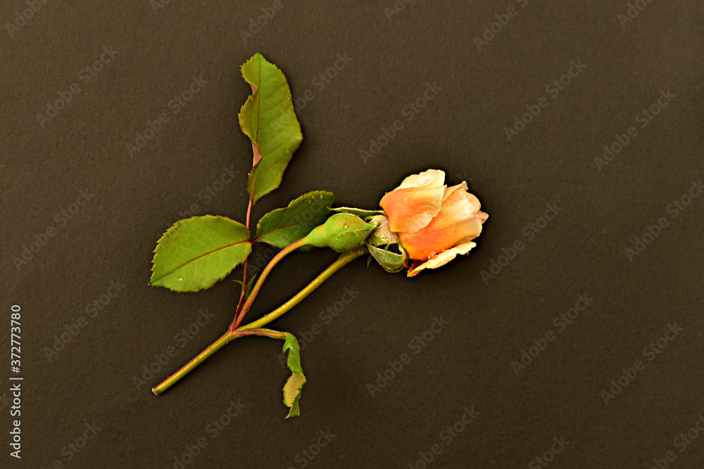 Tea rose with green leaves lies on a dark surface