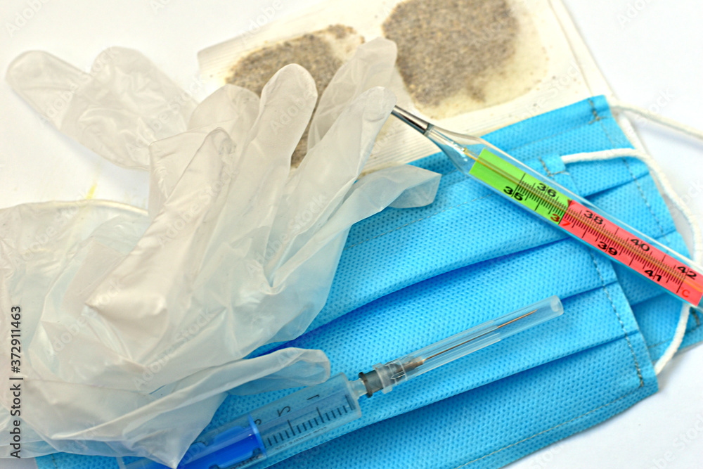 Coronavirus (covid-19). Medical mask, syringe for injections, gloves for the doctor and mustard plasters for the patient.