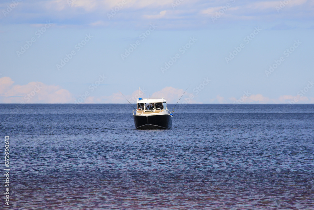 small boat in the distance on the horizon. Big lake