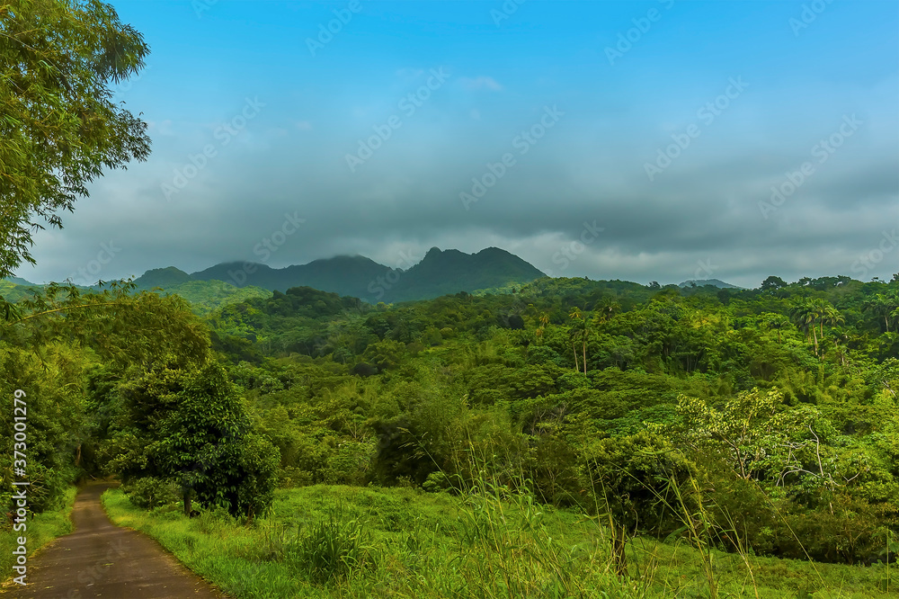 A view across the jungle towards the stratovolcano, Mount Saint Catherine in Grenada