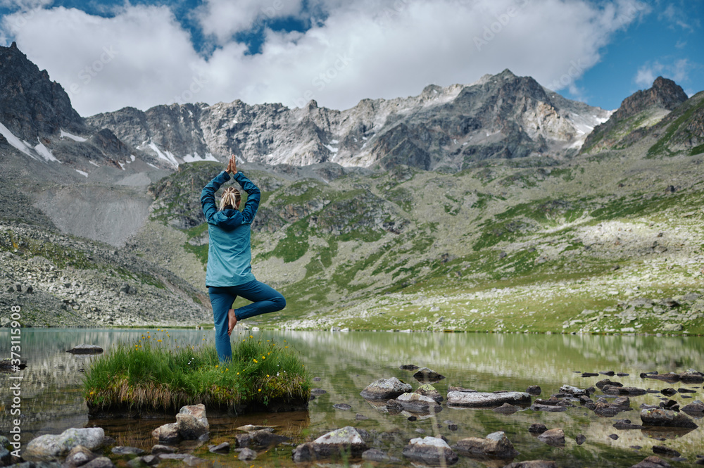 Young woman stays in one leg yoga position against the turquoise lake in the mountains. Extreme hiker girl rest in the wild nature. Trekking lifestyle. Domestic local hike, tourism, travel