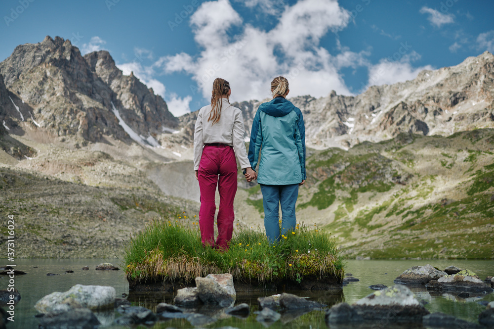 Two young women are staying with their back against the turquoise lake, mountain snowy range. Extreme hikers in wild nature. Trekking lifestyle. Domestic local hike, tourism, travel