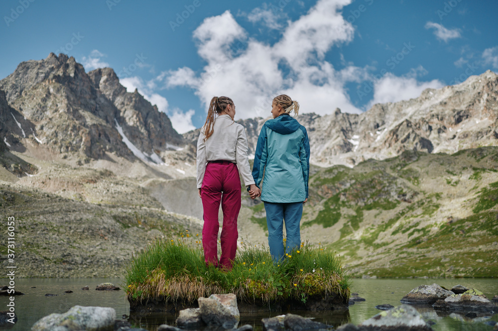 Two young women are staying with their back against the turquoise lake, mountain snowy range. Extreme hikers in wild nature. Trekking lifestyle. Domestic local hike, tourism, travel