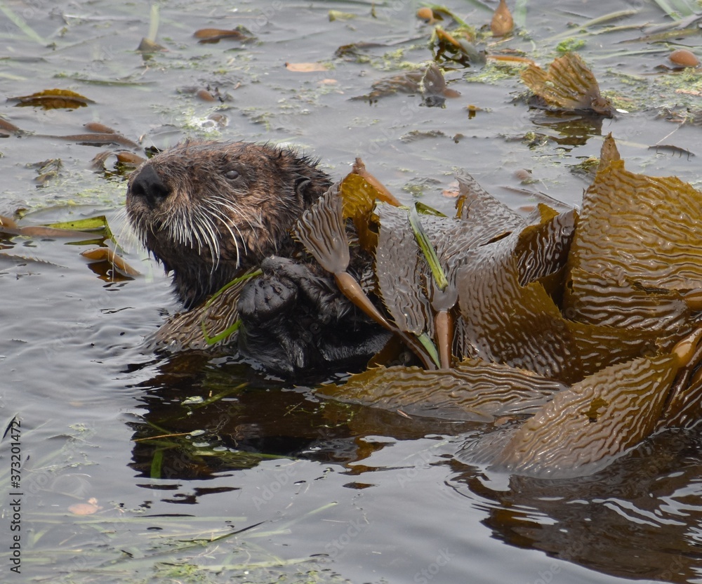 A sea otter (Enhydra lutris) wrapped in kelp along the edge of Elkhorn Slough in California