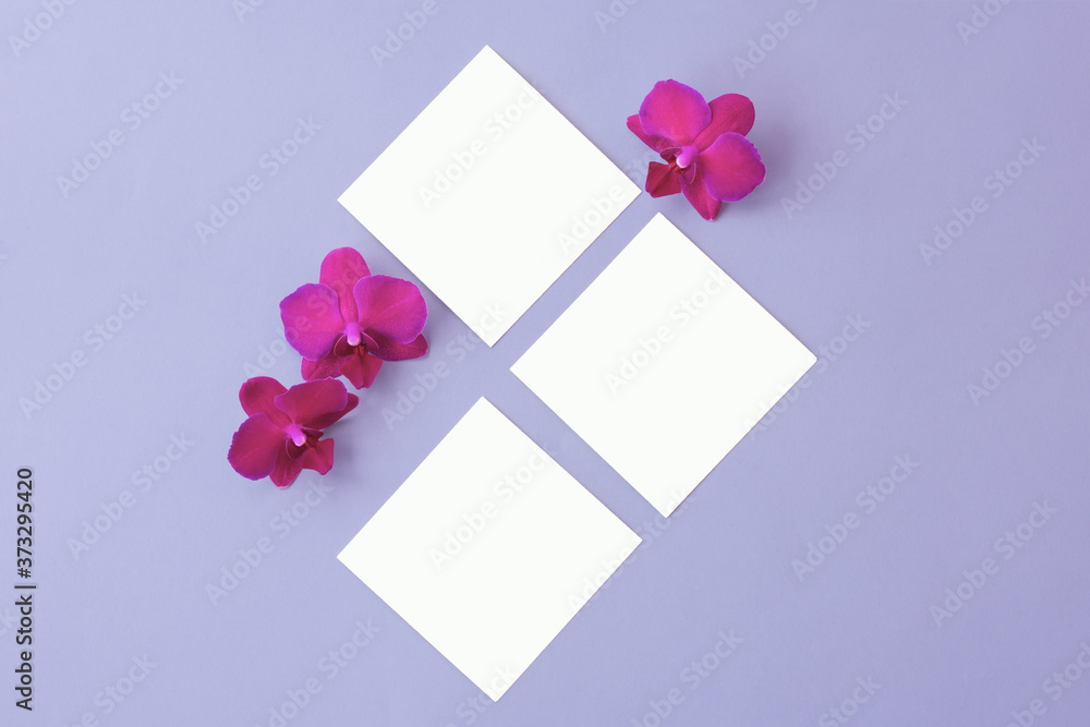 Square notebook sheets with bright pink orchid flowers on blue background.Botanical mock up with tropical flowers