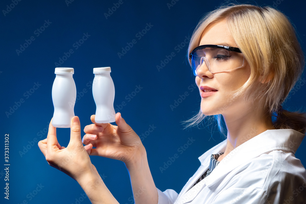 Bio milk food. Two bottles of yogurt in hands of laboratory assistant. Woman medic holds bottles of bio food in her hands. Concept Medic recommends use of organic dairy products. Bio food production
