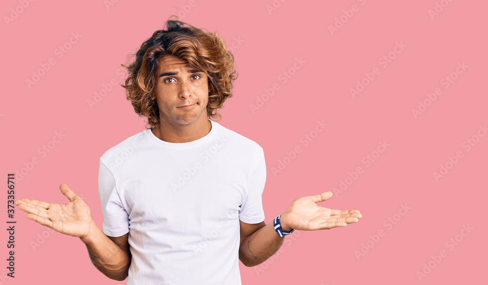 Young hispanic man wearing casual white tshirt clueless and confused with open arms, no idea concept.