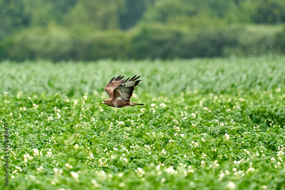 One common buzzard, buteo buteo, on spring field, one buzzard with spread wings taking, place for text