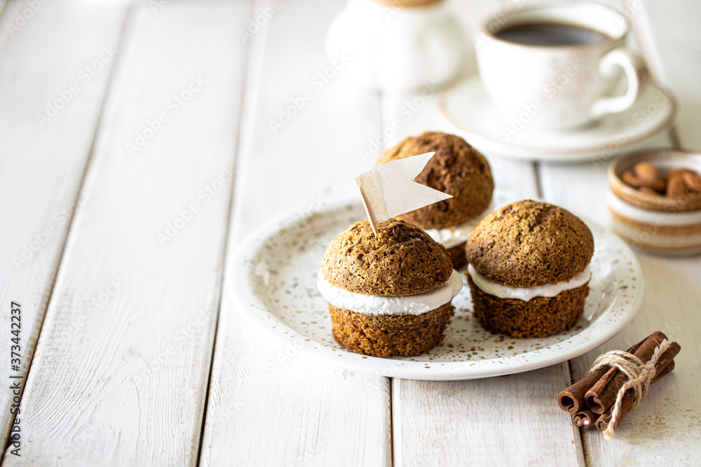 Carrot muffins with nuts and cream on a white plate. Vegan muffins. Traditional donkey pastries. Selective focus. Copy space.