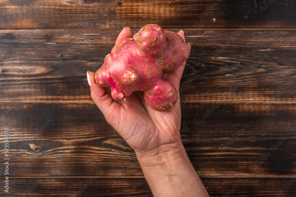 Womans hand holds trendy ugly organic potato from home garden on on a wooden background, unnormal vegetable or food waste concept, copy space