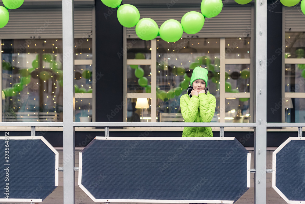 A young girl dressed in a light green jacket and hat standing on the street at the glowing shop window. Balloons, luminous garland, decorated facade, place for text