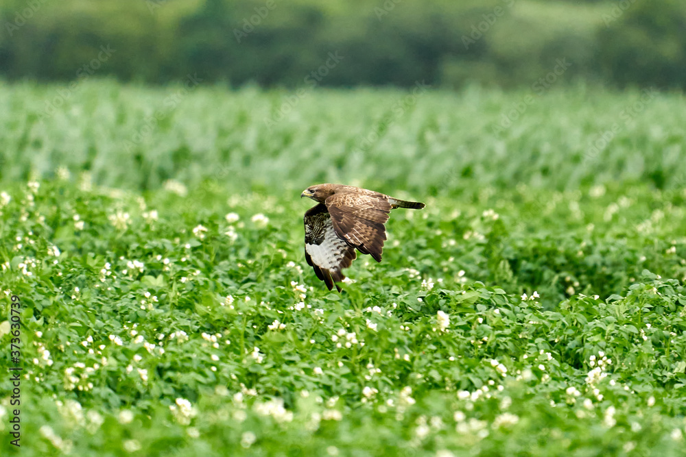 One common buzzard, buteo buteo, on spring field, one buzzard with spread wings taking, place for text
