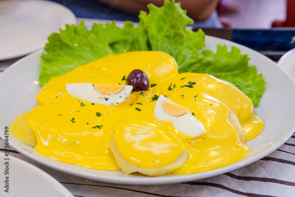 Papas a la Huancaína is a delicious Peruvian dish consists in sliced cooked potato with an aji and fresh cheese yellow sauce, boiled eggs and olives. Traditional Peruvian food concept.