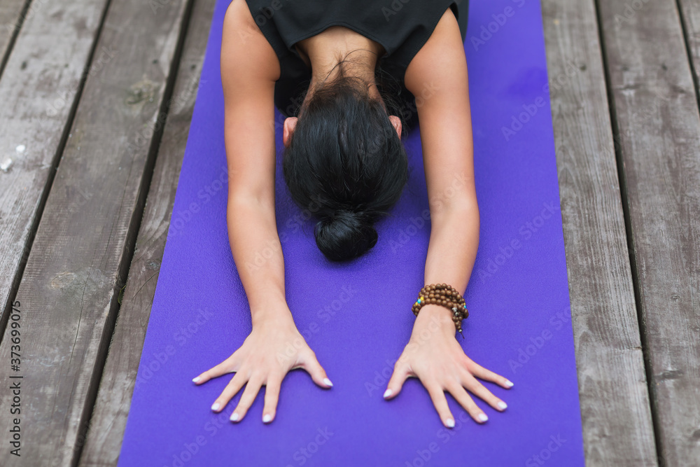 A young woman in sportswear sits on a carpet, practices yoga asana, performs a childs pose