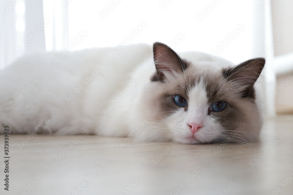 더워서 바닥에 엎드린 파란눈의 랙돌 고양이