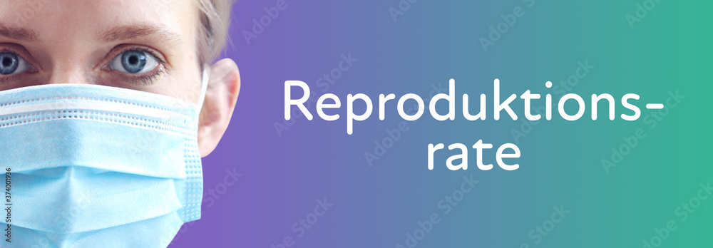 Reproduktionsrate (Coronavirus). Portrait von schöner Frau mit Mundschutz (Close up). Text auf Hintergund (lila/türkis). Krankenschwester