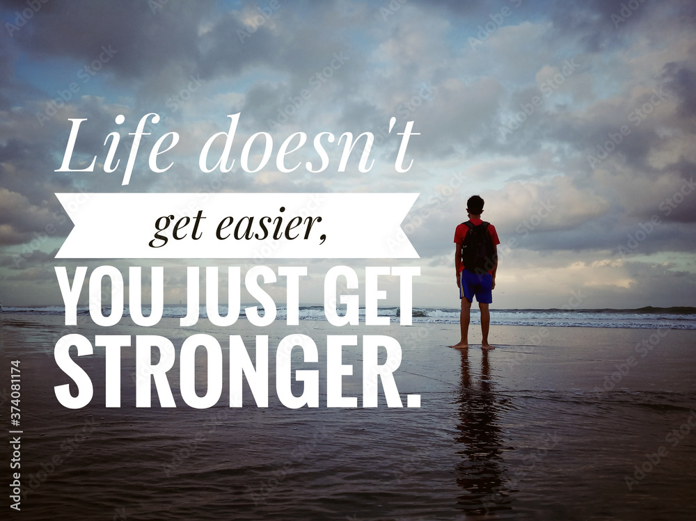 Inspirational motivational quote - Life does not get easier. You just get stronger. On background of young man standing in the beach against the sunset sunrise light over the sea.