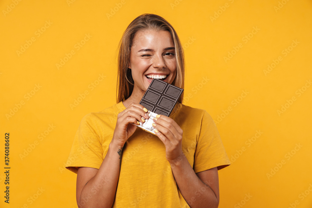 Image of blonde joyful woman winking and holding chocolate