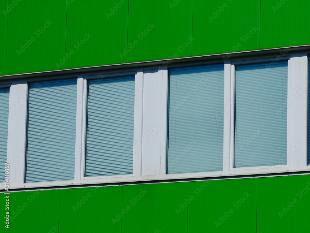 closeup of bright green color metal exterior siding of office building with white plastic strip windows. light gray window blind or shade. modern architecture concept. textures and patterns.