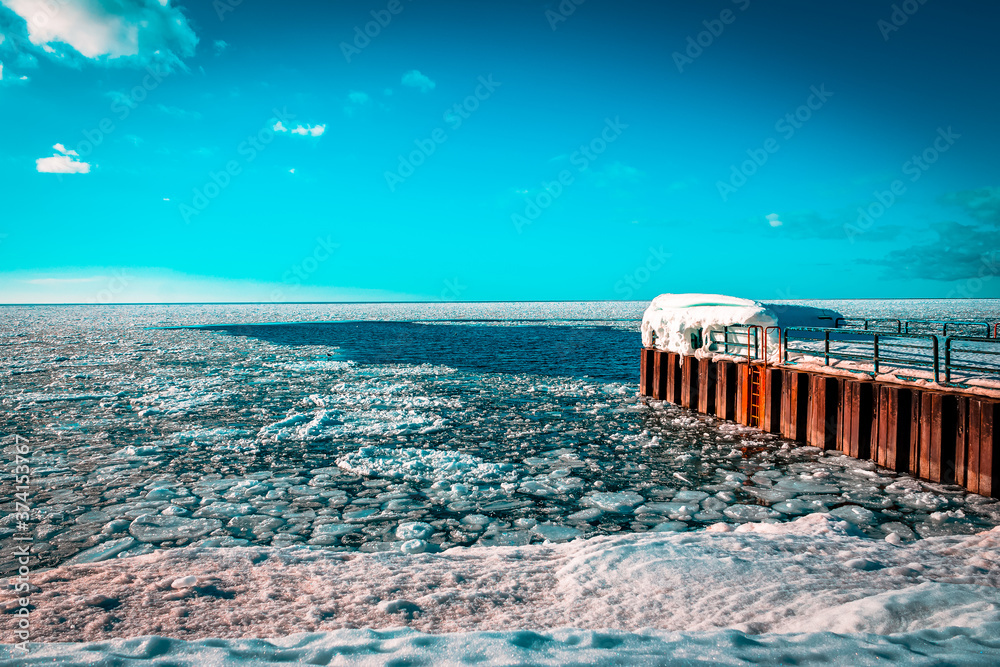 Lake Michigan frozen over during the winter waiting to thaw out in the sun