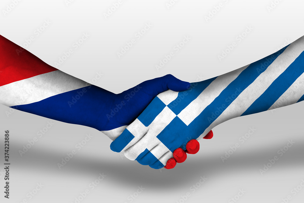 Handshake between greece and thailand flags painted on hands, illustration with clipping path.