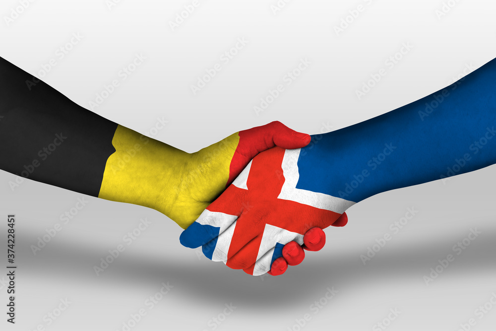 Handshake between iceland and belgium flags painted on hands, illustration with clipping path.