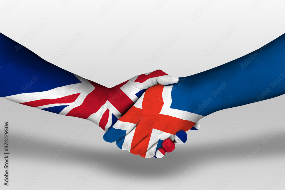 Handshake between iceland and united kingdom flags painted on hands, illustration with clipping path.