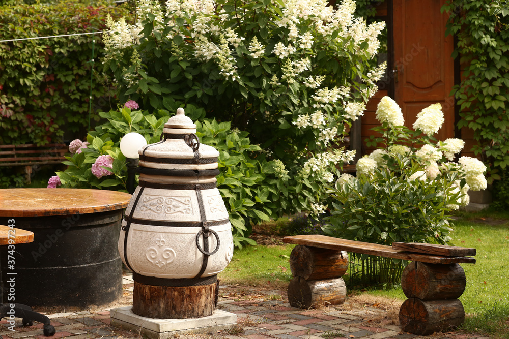 beautiful formal garden with dining place, table tandoor bench