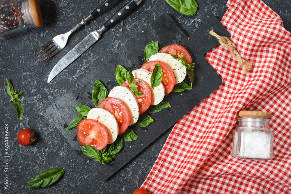 Traditional Italian Caprese Salad - sliced tomatoes, mozzarella cheese and basil on dark stone background