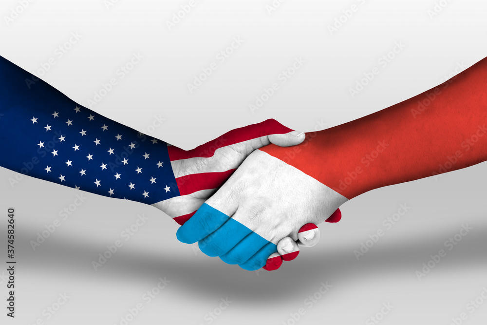 Handshake between luxembourg and united states of america flags painted on hands, illustration with clipping path.