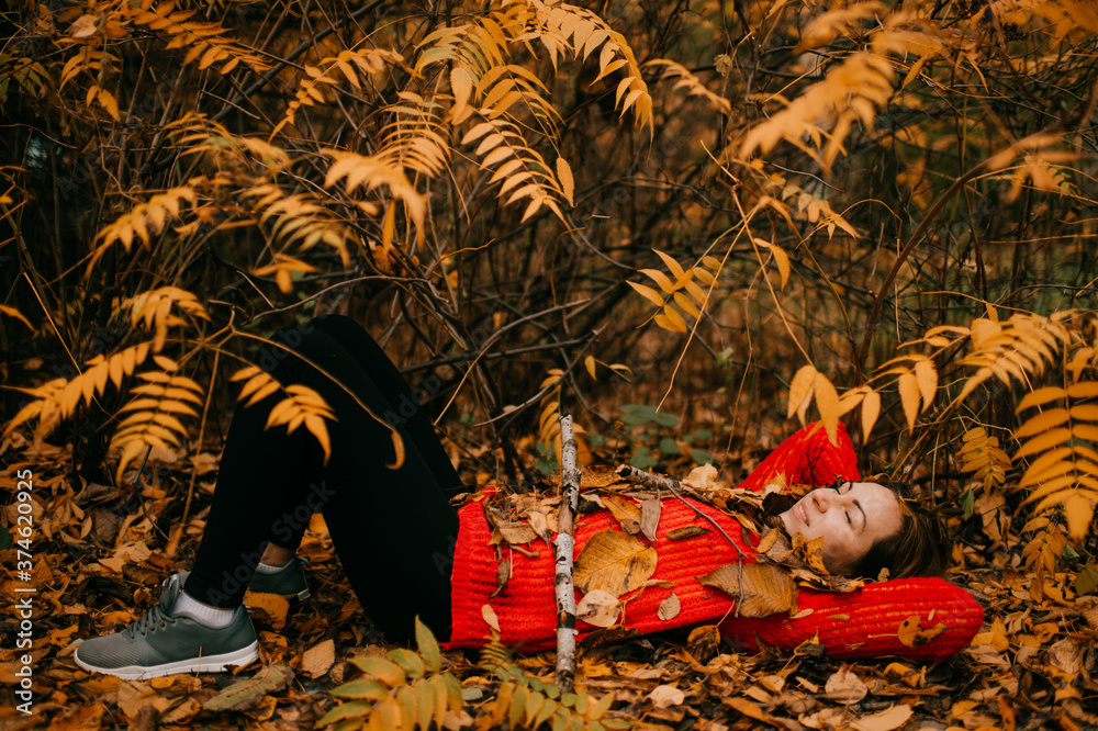 Beautiful caucasian female with pretty face in a red sweater, black pants and colourful knitting hat lies on the yellow grass under the tree