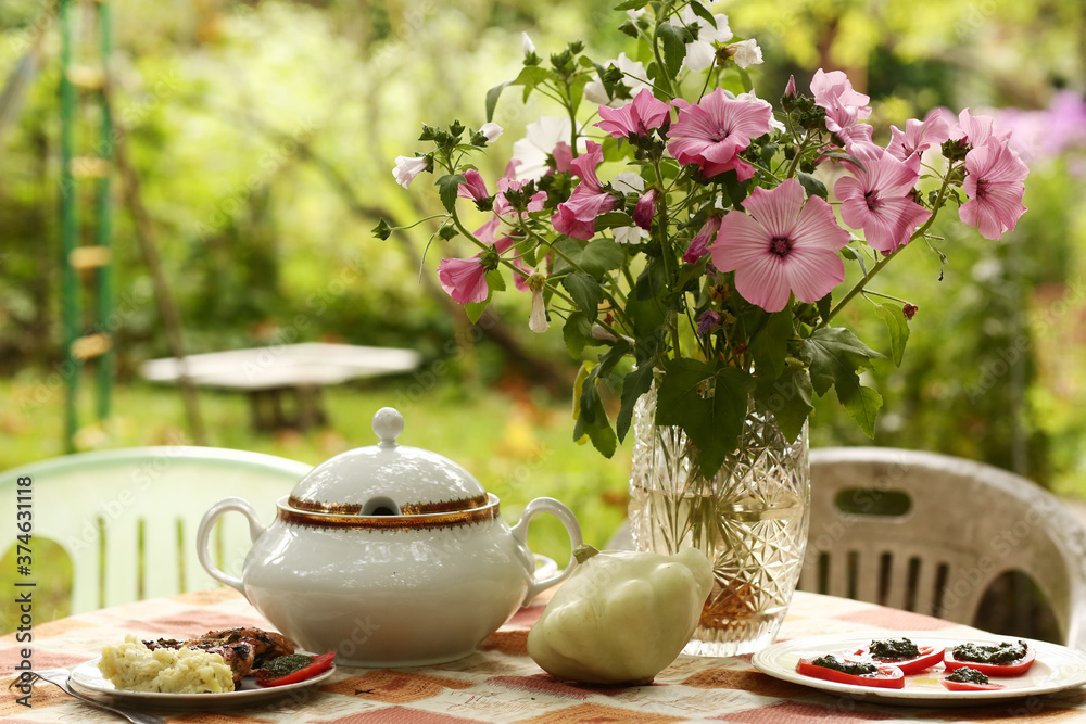 country outdoor still life with tureen, patisson, mashed potato and tomato with pesto sauce