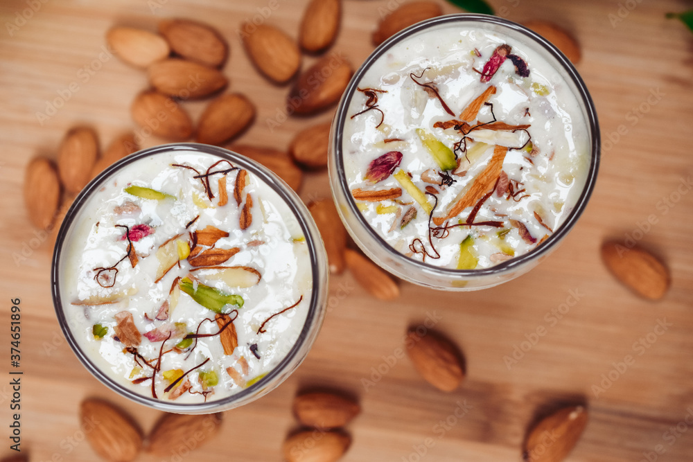 Top view of almond milk shake on wooden table with almonds in background.