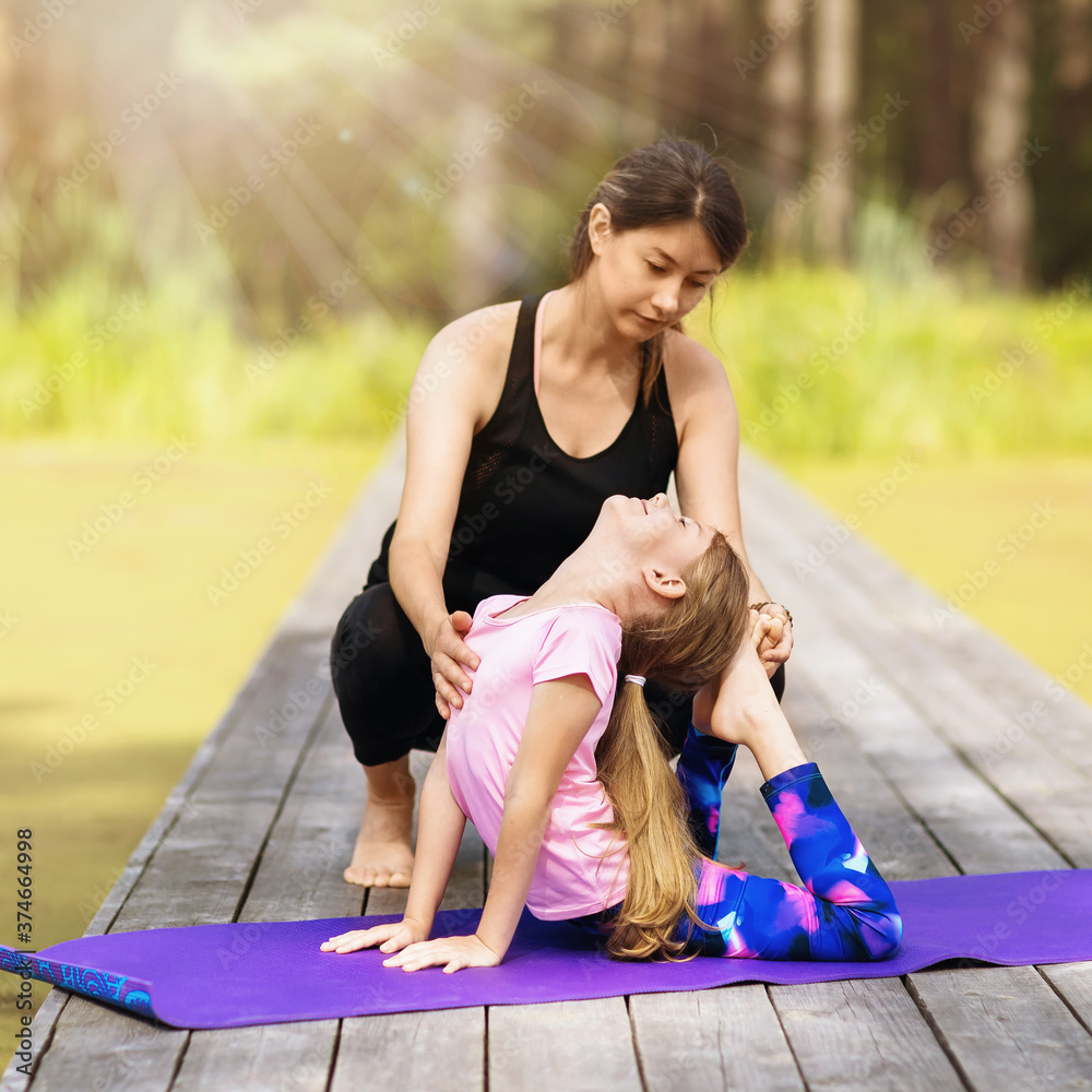 Mom and daughter perform gymnastic exercises on a sunny summer morning in the park on a wooden bridge