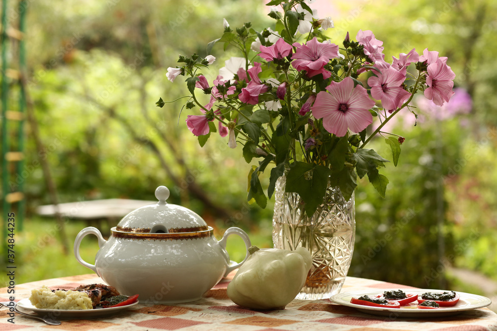 country outdoor still life with tureen, patisson, mashed potato and tomato with pesto sauce