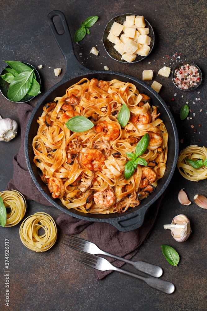Italian fettuccine pasta with seafood. Seafood pasta with mussels, shrimp and octopus with basil in a cast iron pan