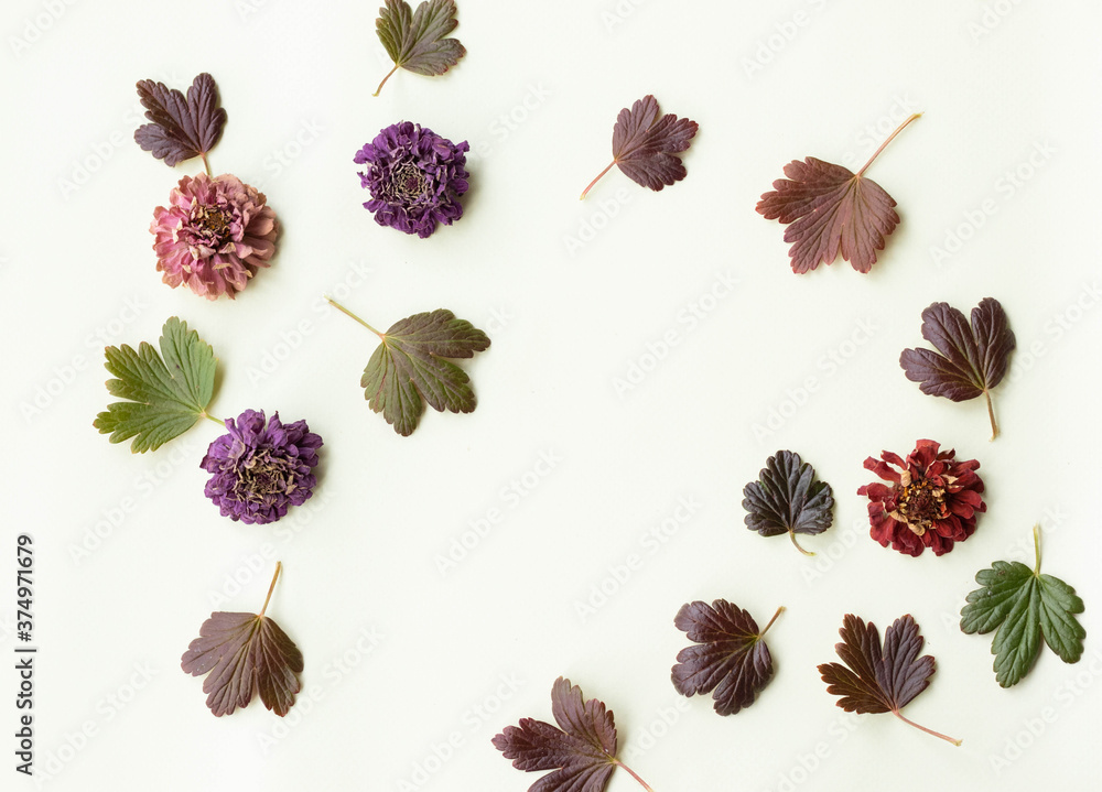 Autumn composition with gooseerry dry leaves and zinnia flowers on light lemon background. Autumn, fall, thanksgiving day concept. Flat lay, top view, copy space