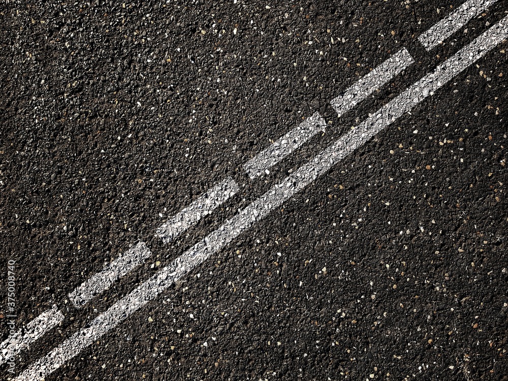 Dotted and solid double white lines on asphalt road.