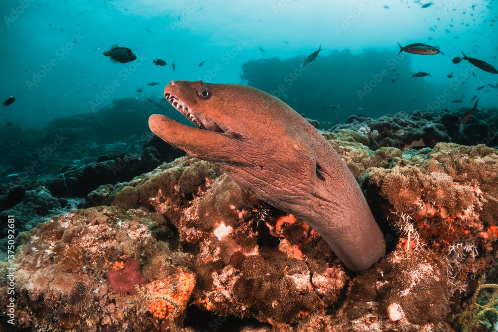 Moray eel among colorful coral reef surrounded by tropical fish in clear blue water, Maldives, Indian Ocean