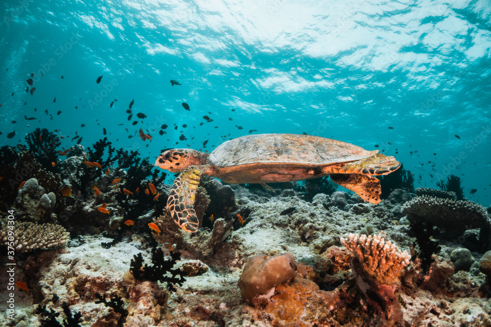 Sea turtle swimming among colorful tropical fish and coral reef in The Maldives, Indian Ocean