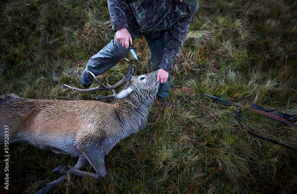 A hunter holding a knife in his hand preparing to skin a dead deer after he killed it on a hunting trip in Scotland.