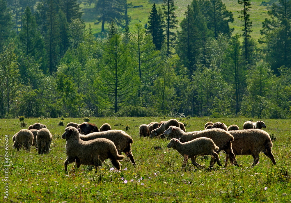 The high pastures of the Altai mountains, Russia. mountain Altai. Sheep grazing peacefully in the larch valleys of the Yabogan river.