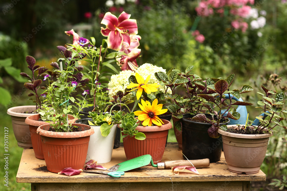 red lily phloxes hydrangea flowers pot plants on green summer garden background
