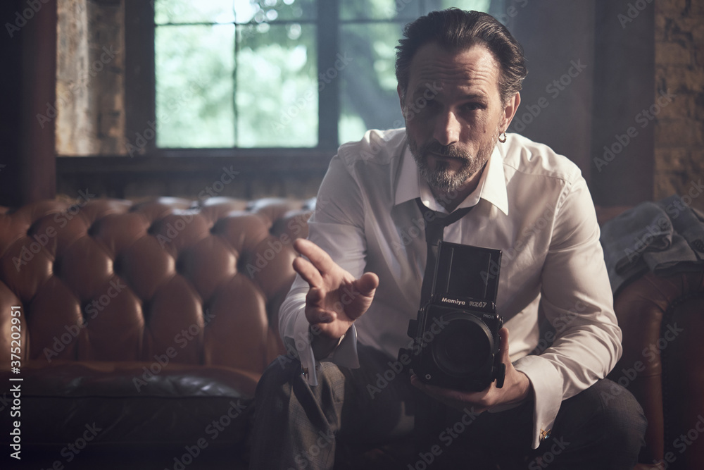 cinematic photo shoot of the confident actor celebrity look in foggy loft room