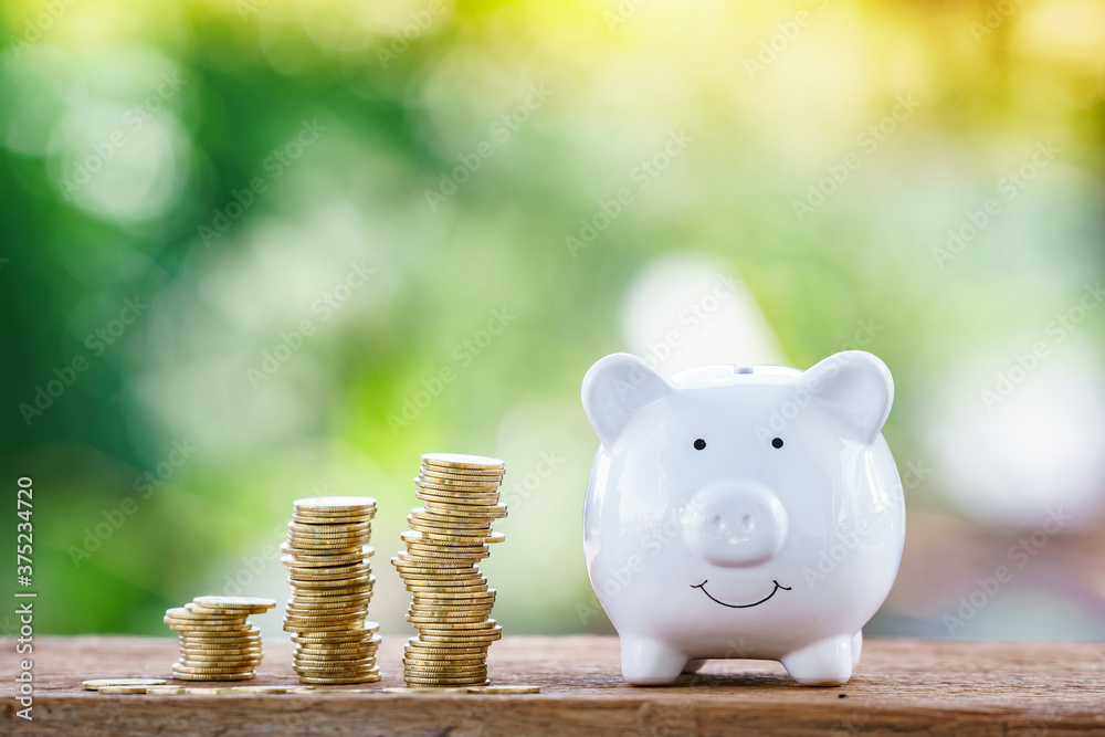 Piggy bank with the many stack gold coins with growth of value the benefit from dividends put on the table in the backyard, Saving money for business Investment and spending concept.