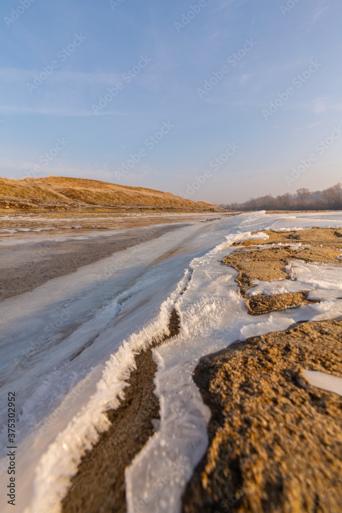 Hoarfrost and fresh powder snow in winter, on a wild, beautiful, river bank
