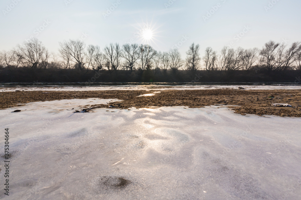 Cold winter morning on a wild river bank, with frost and fresh snow